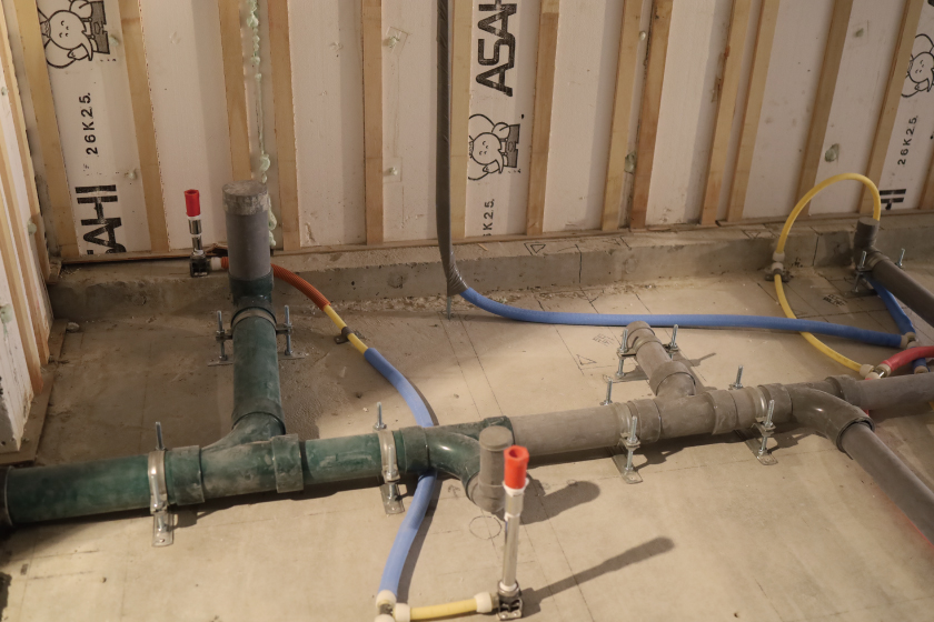 普段の生活では床の裏に隠れて見えないカラフルな配管は、ガスや水道の配線です。