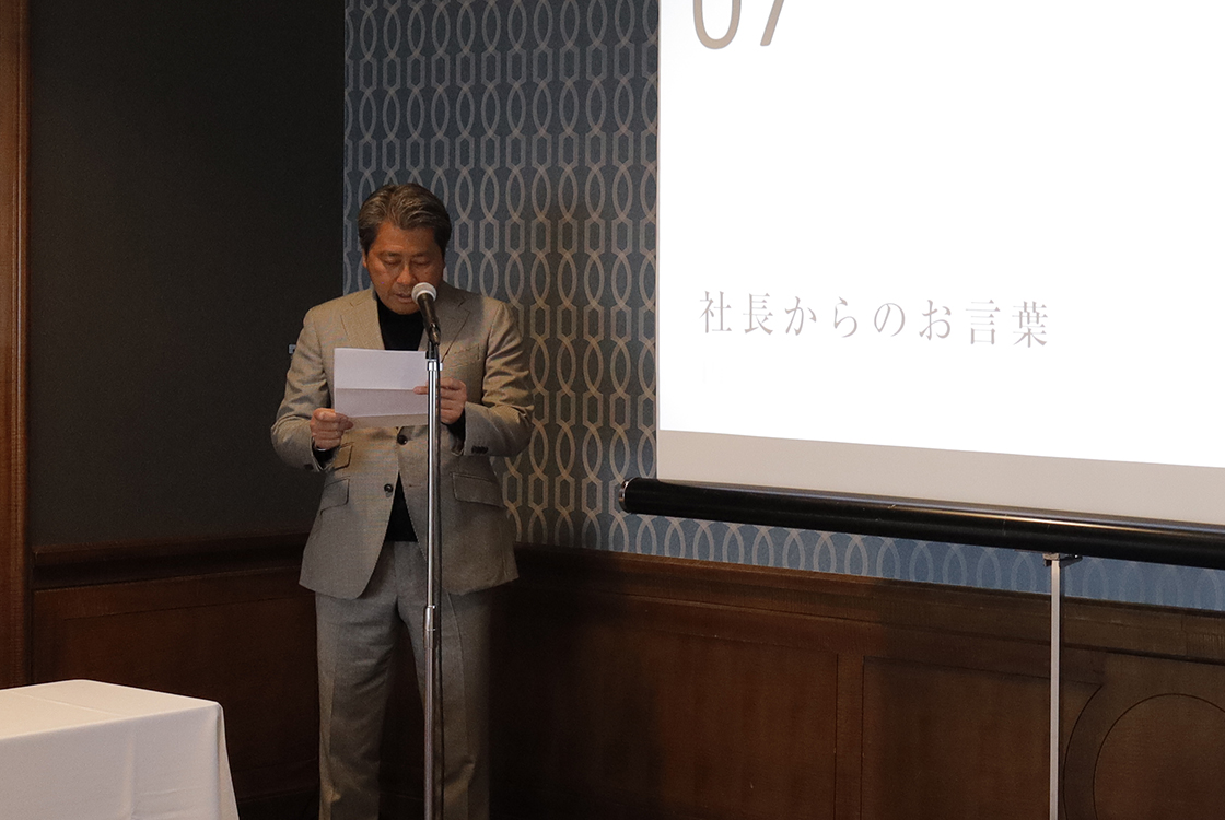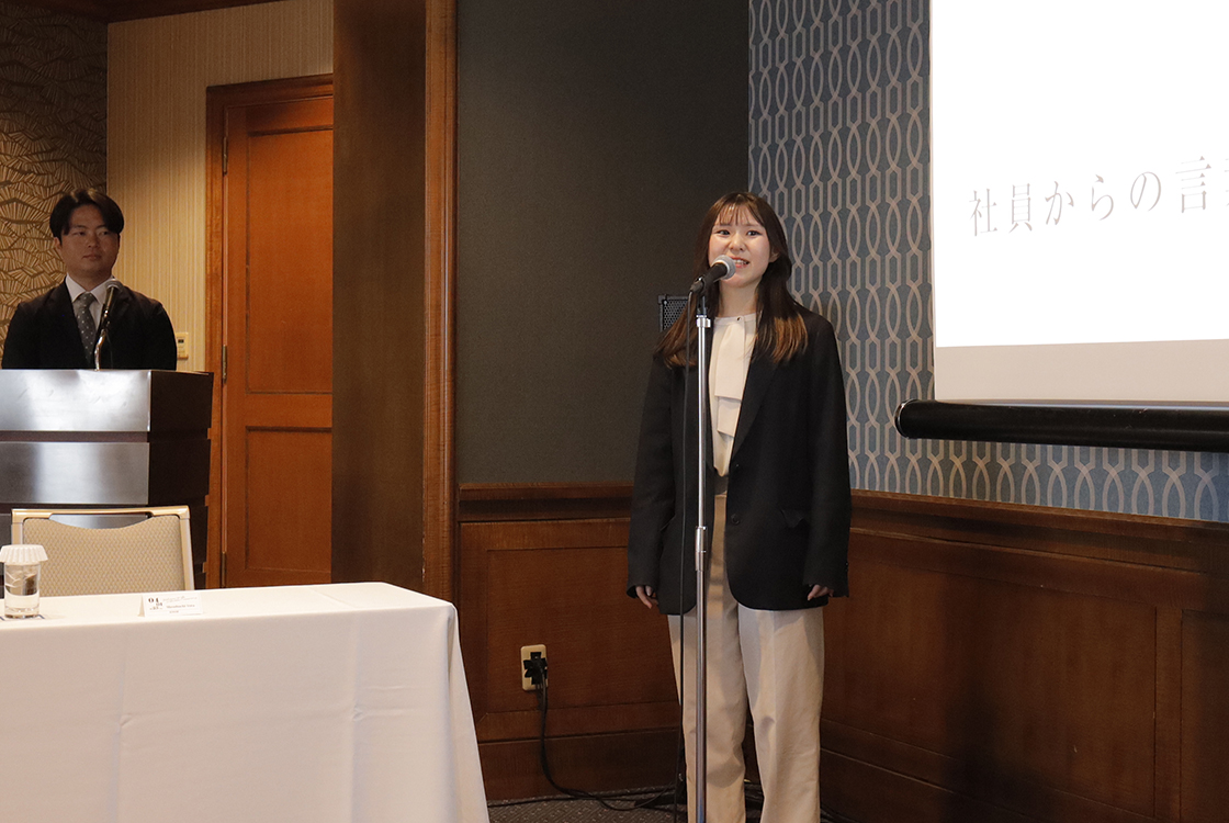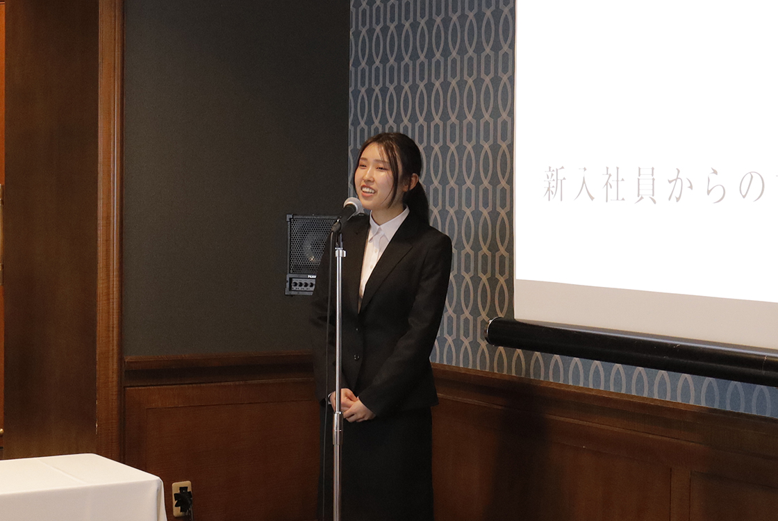 まずは社員、代表から新入社員のMさんへ歓迎の言葉を送りました。