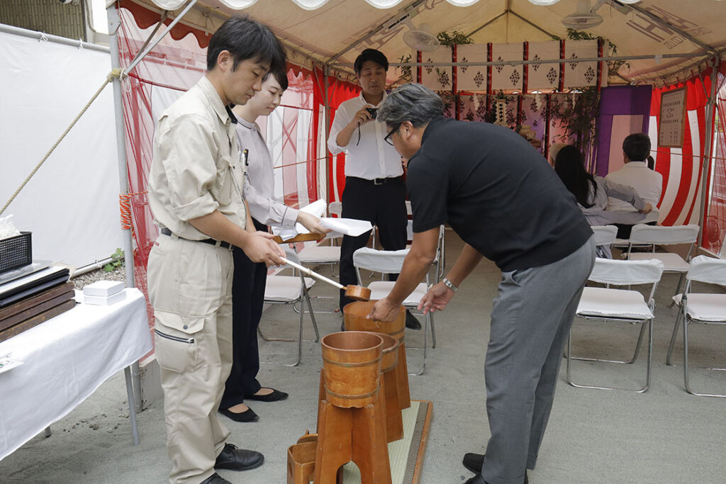 こちらは手水の儀(てみずのぎ)と呼ばれる、地鎮祭に参加する全員が初めに行うお清めの儀式です。