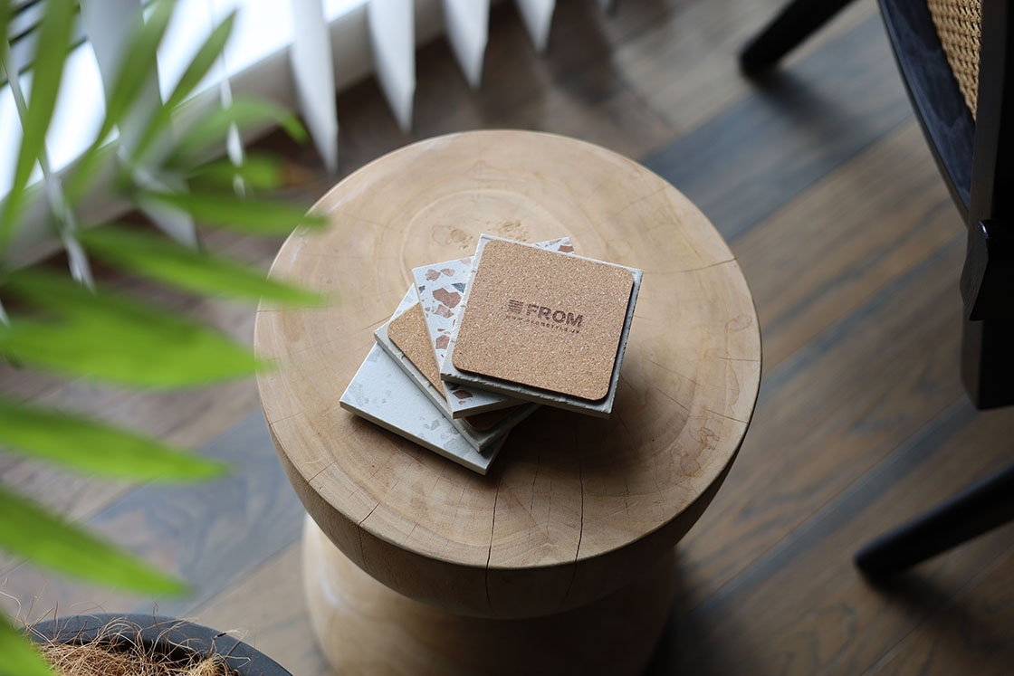裏面のコルク部分には一つ一つ手作業で、FROMのロゴをあしらいました!