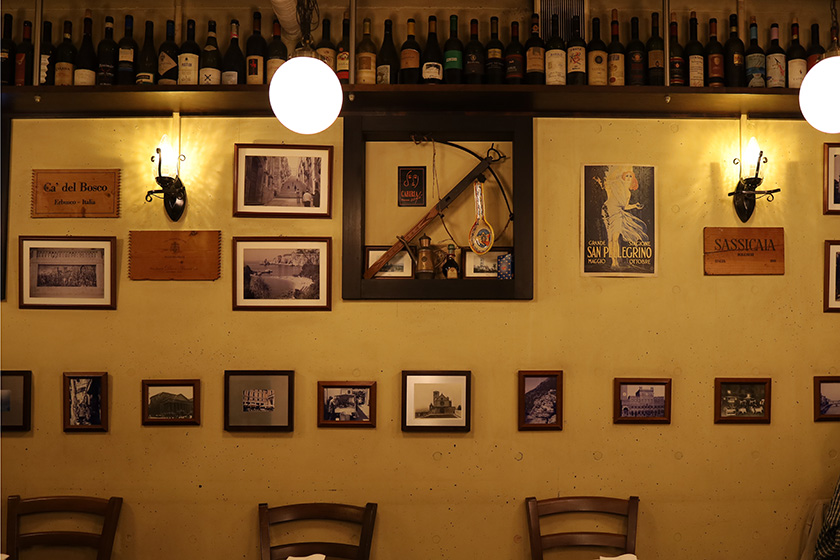 店内はオレンジの照明に包まれたおしゃれな雰囲気で、壁にはたくさんの絵が飾られています。