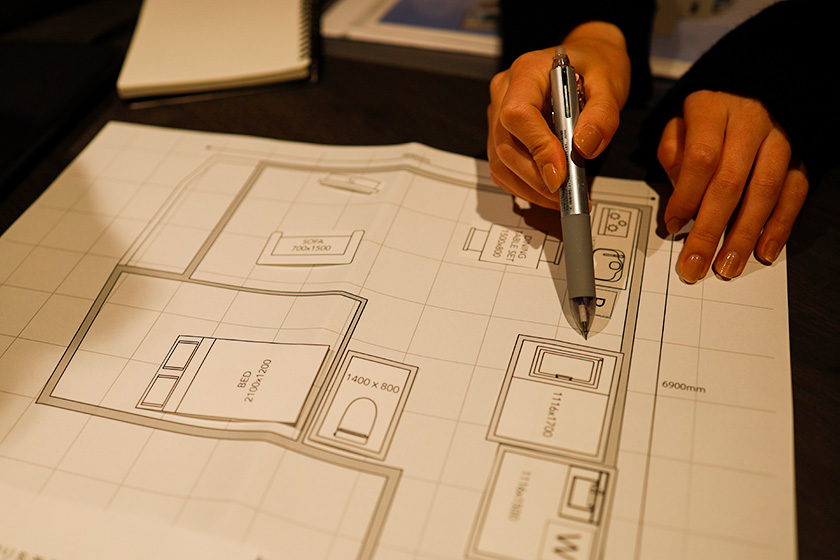 今回は事前に「上石神井プロジェクト」を例に、2班に分かれて間取りと家具配置を考案。