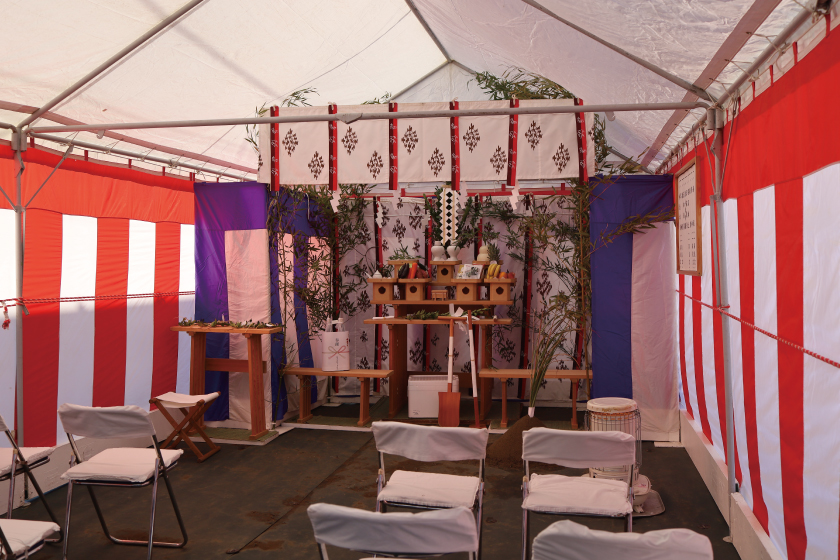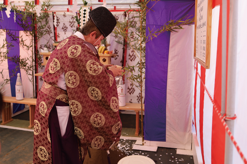 土地の四方に米を模した紙を撒くことで土地のお清めを行い、工事の安全と建物の繁栄を祈願します。