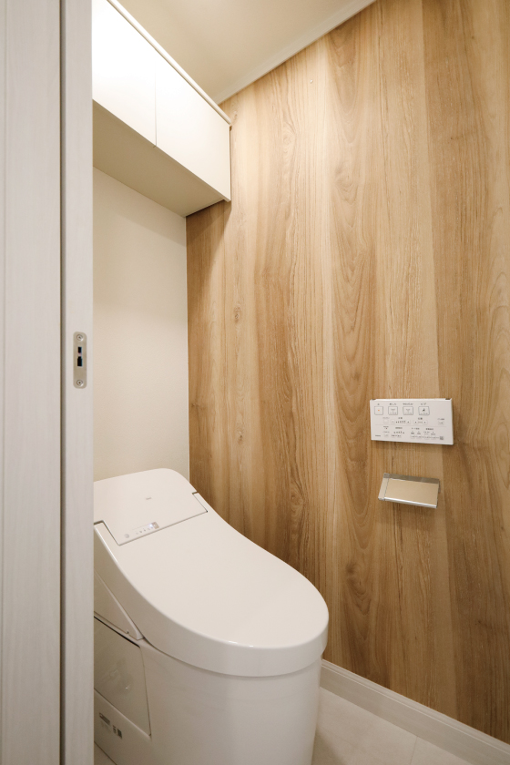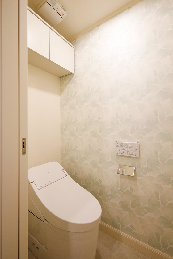 お手洗いにはすべてのお部屋で異なる柄のアクセントクロスを採用いたしました!