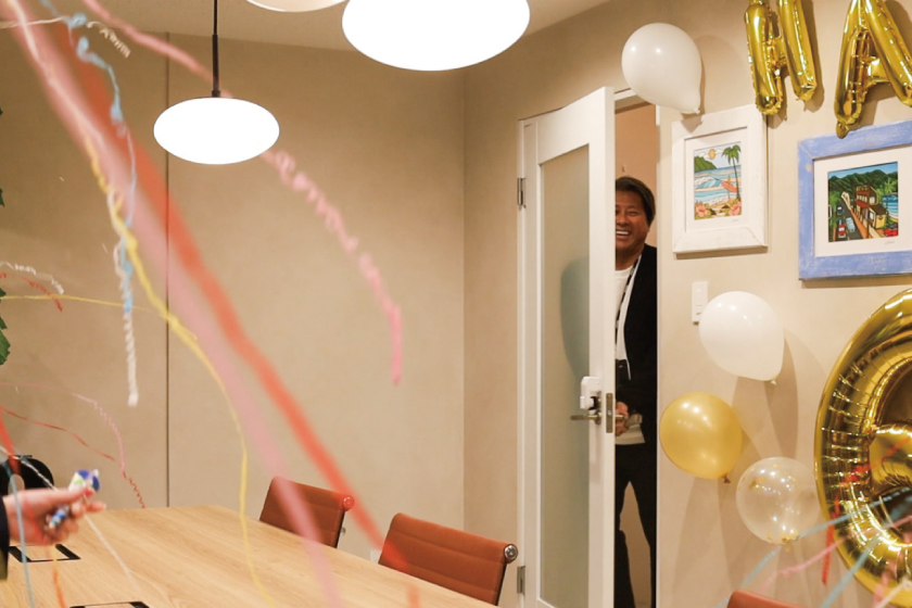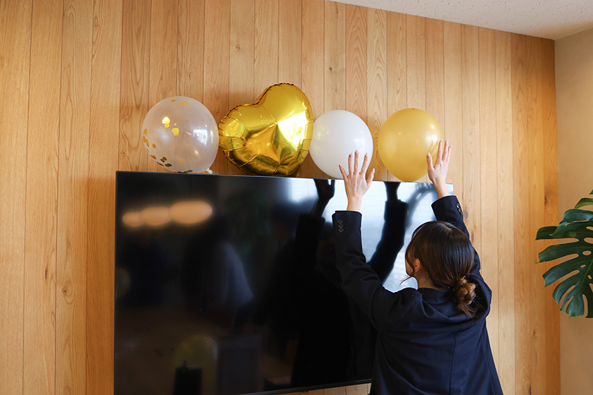 当日は、代表の外出中に一番広い応接室をバルーンなどで飾り付け。