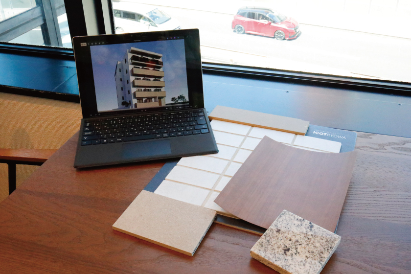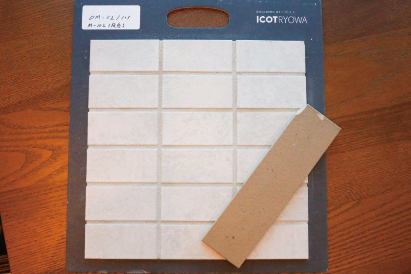 建物のメインとなる外壁には、アイコットリョーワの「グリッドモルタル(45二丁掛タイル)」のホワイトを採用しました。