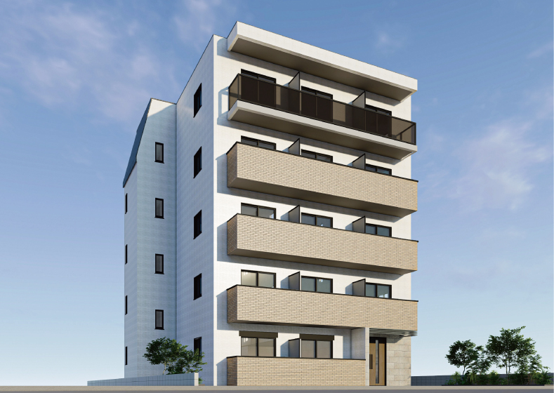 建物の表情に奥行きを与えるため、バルコニー部分には温かみのあるベージュの二丁掛けタイルを配しました。