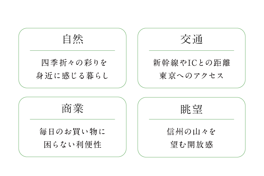 私たちは、はじめての移住でも安心して新生活をスタートしていただけるよう、「自然・交通・商業・眺望」の4つの条件が揃った土地を厳選して販売しております。