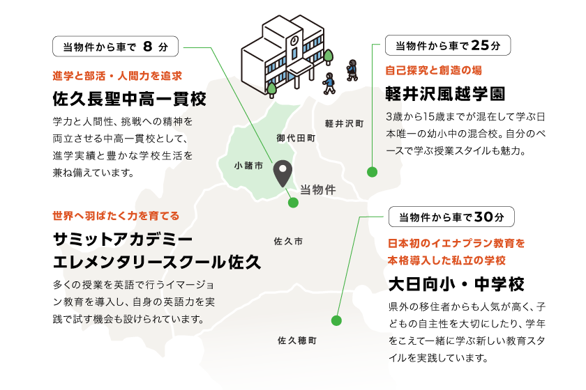 周辺には、全国的にも有名な佐久長聖中高等一貫校をはじめとする教育機関も充実!