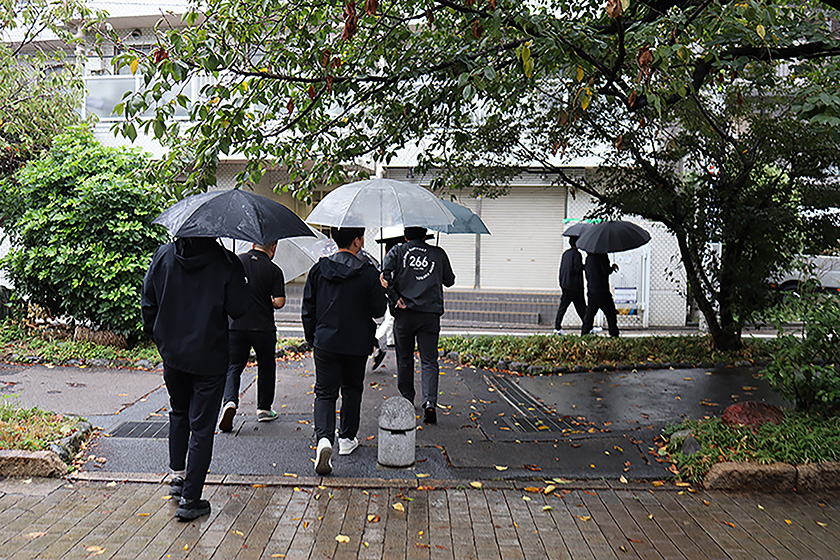 あいにくのお天気ではありましたが、例大祭は予定どおり開催とのことで、傘を差して出発。