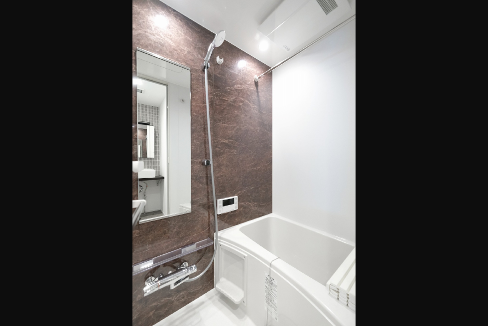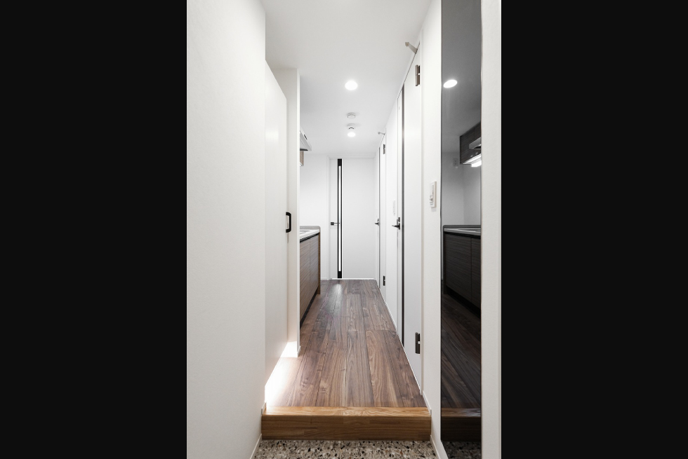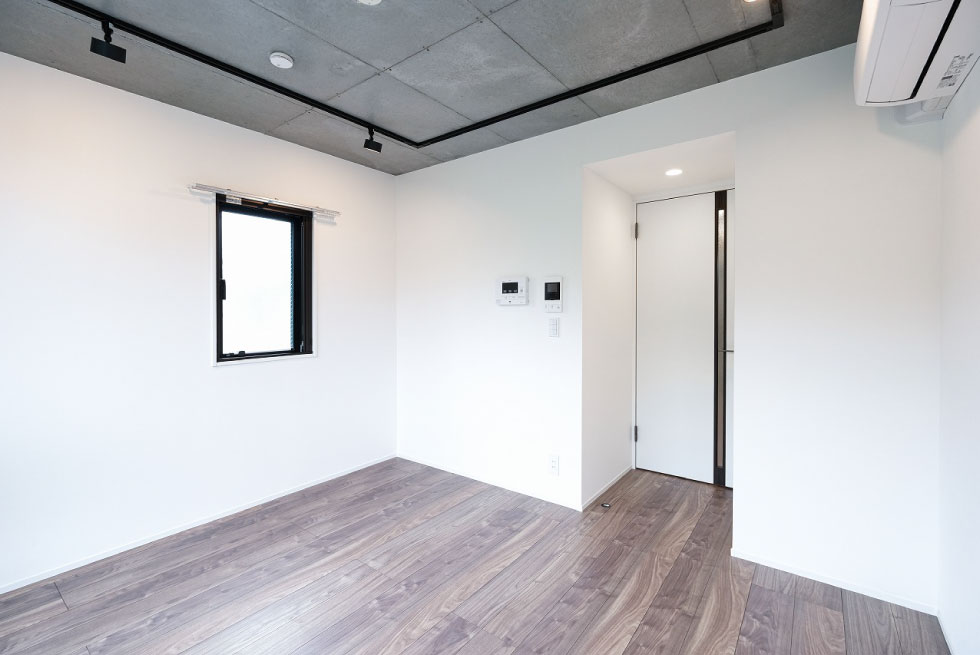 建物の顔となる館名で使用している真鍮素材は時間の経過とともに表情を変化させます。あんどんに照らされたエントランスは、ハワイにあるホテルの空気感を取り入れ、住人を優しく出迎える暖かな光を放ちます。室内の壁の塗り素材と、天井部分の打ち放しコンクリートの素材でテクスチャーに変化をつけました。
