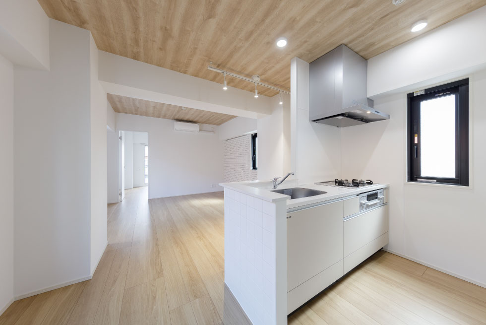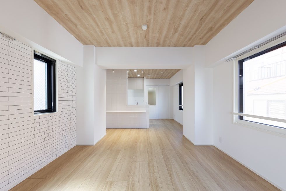 1.2階店舗は、室内外のどちらの様子も見えるようにガラス張りとしました。3階から5階は1フロア1住戸としそれぞれ異なるインテリアエレメントで構成し、個性が際立つ室内としました。キッチンはオープンキッチン仕様で、ゆるやかに空間を繋げ、居室を見渡す開放感を叶えます。外観はトーンを合わせた異なる素材を使用し、統一感を設け、街に寄り添うデザインとしました。