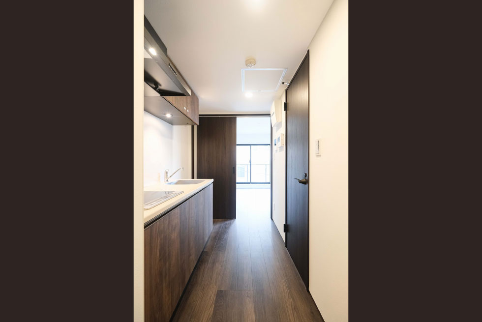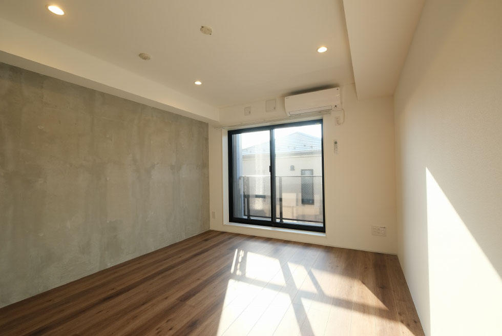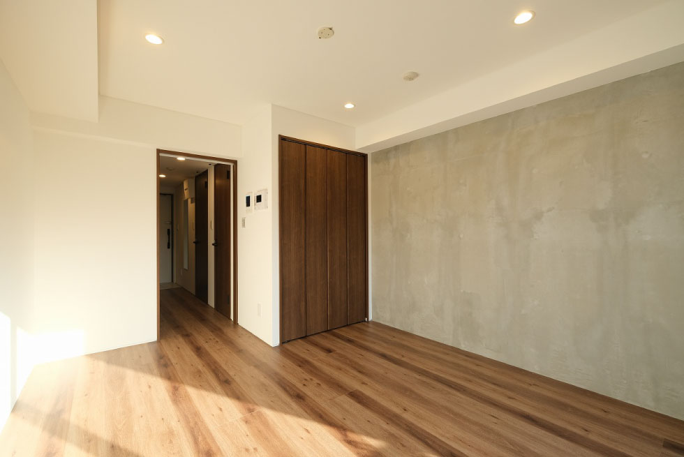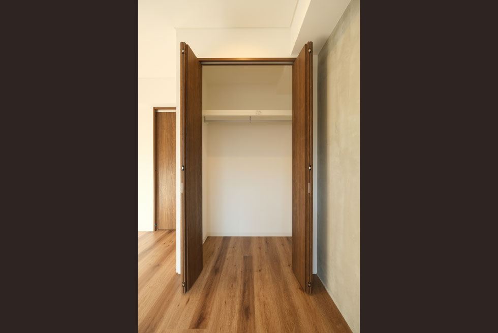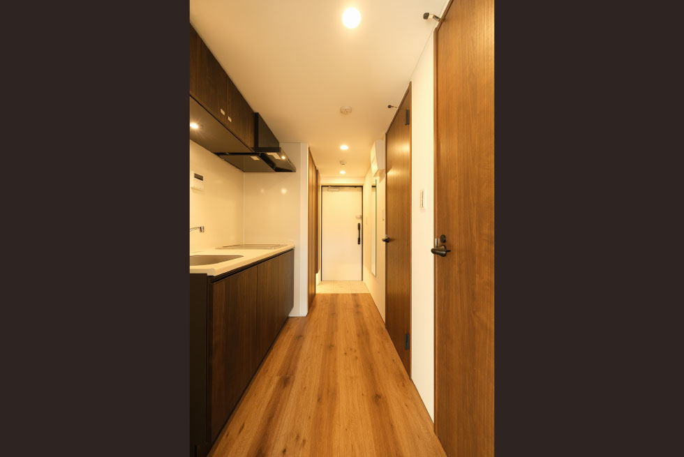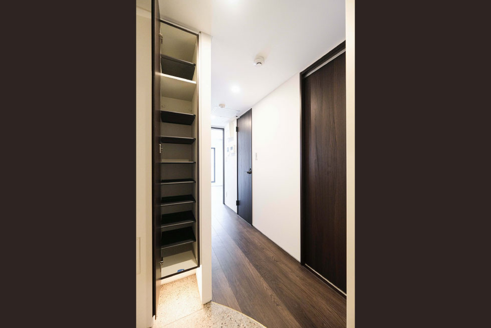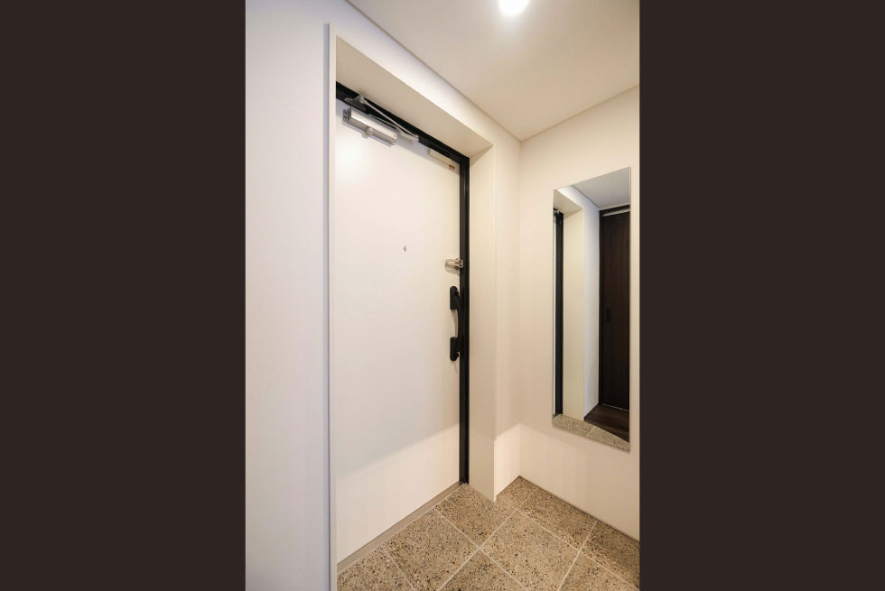 エントランス上部のアール型の天井と、それを照らす関節照明が柔らかな空間を演出します。1階共用部はブラックやブラウンでシックにまとめ、2階はホワイトを多く使用し、真鍮の切り文字をあしらうことで落ち着いた印象を与えます。下の階とは異なりつつ統一感のあるデザインで、ラグジュアリーな空気が漂います。また、室内はホワイトとウッドの優しい色合いが調和し、コンクリート壁のアクセントを加えることで、住む人に洗練された暮らしを提供します。