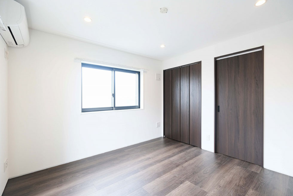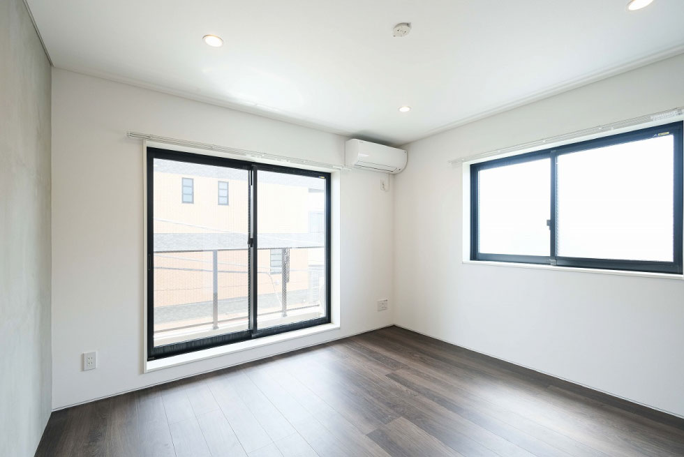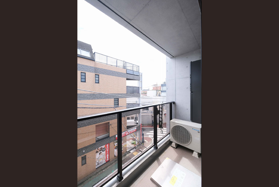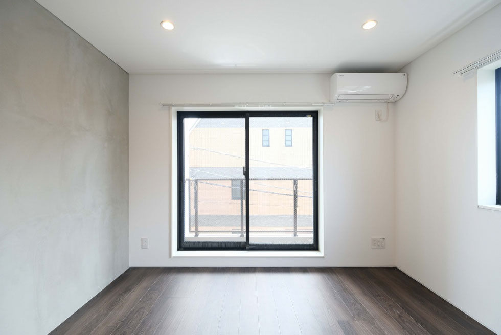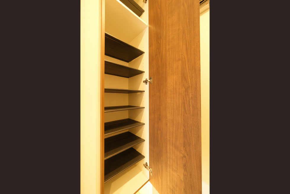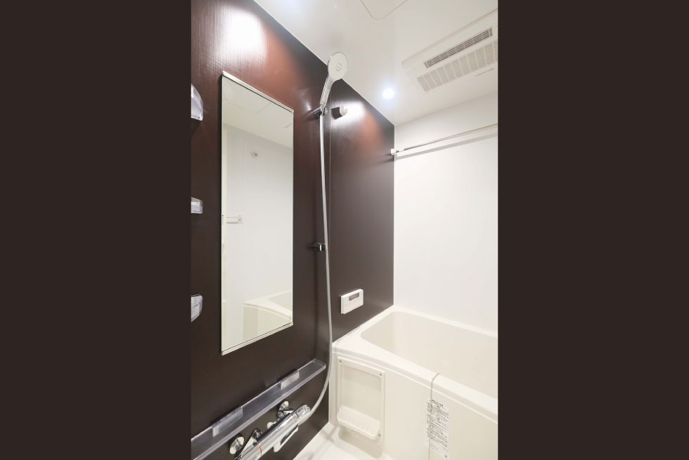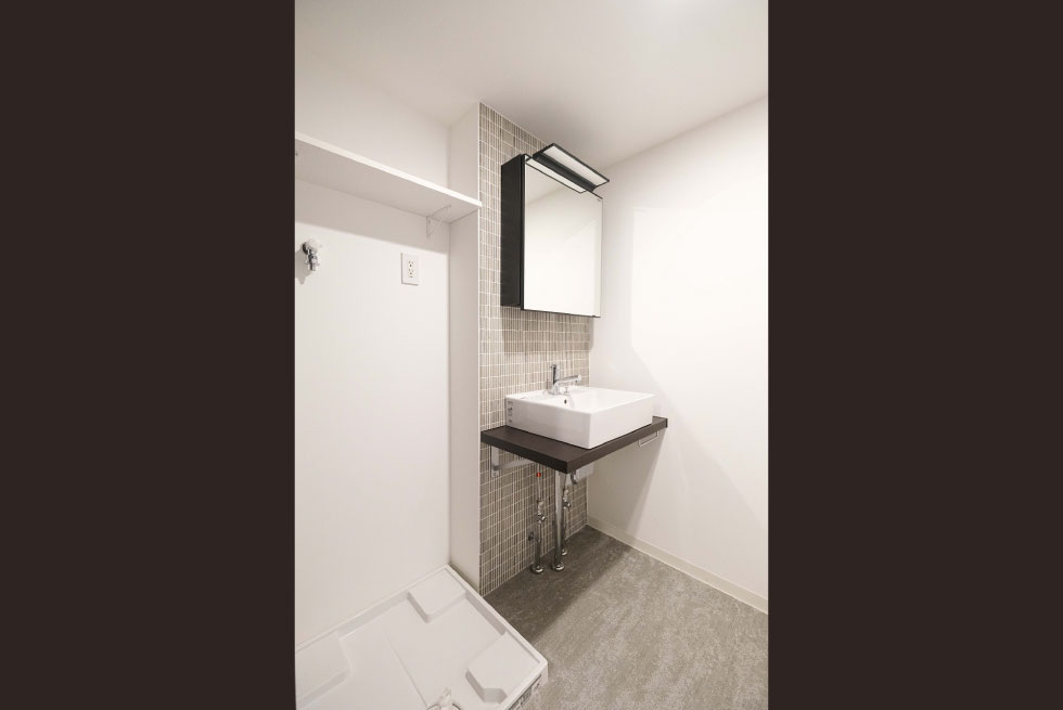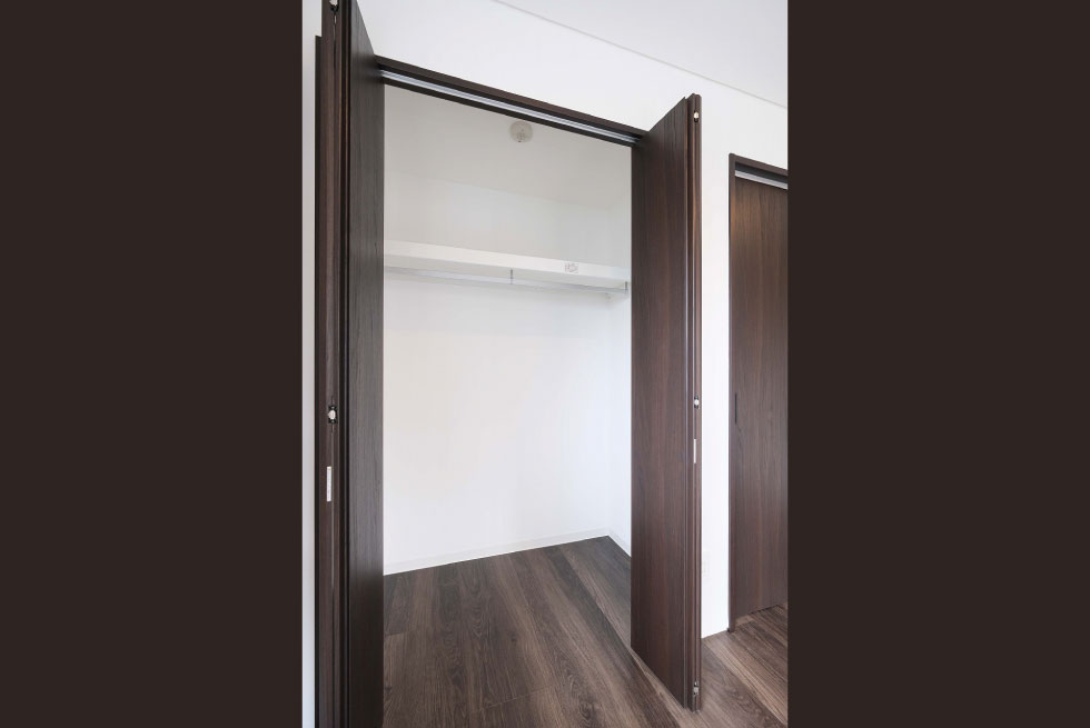 エントランス上部のアール型の天井と、それを照らす関節照明が柔らかな空間を演出します。1階共用部はブラックやブラウンでシックにまとめ、2階はホワイトを多く使用し、真鍮の切り文字をあしらうことで落ち着いた印象を与えます。下の階とは異なりつつ統一感のあるデザインで、ラグジュアリーな空気が漂います。また、室内はホワイトとウッドの優しい色合いが調和し、コンクリート壁のアクセントを加えることで、住む人に洗練された暮らしを提供します。