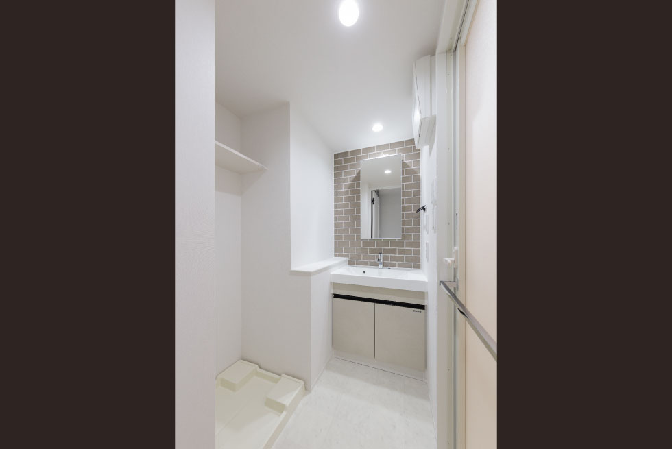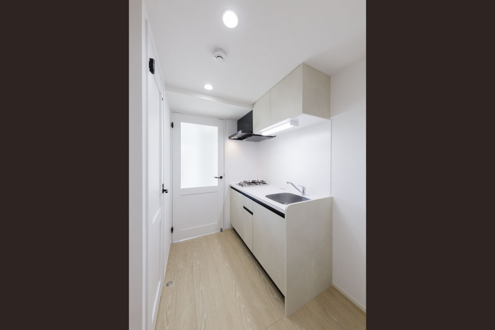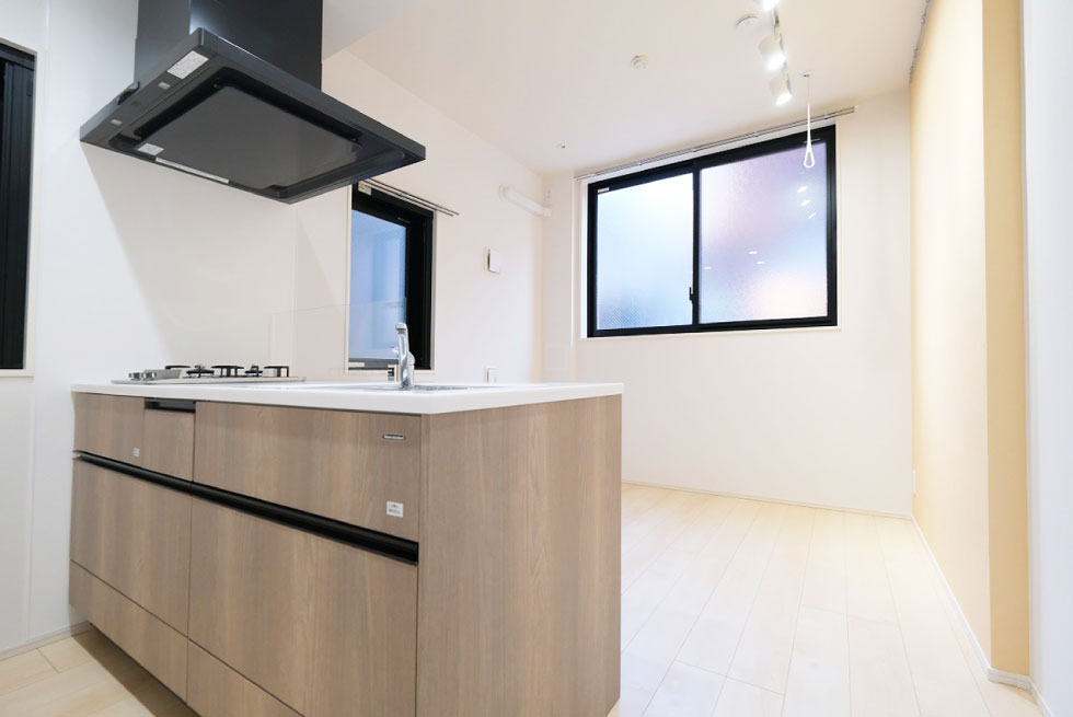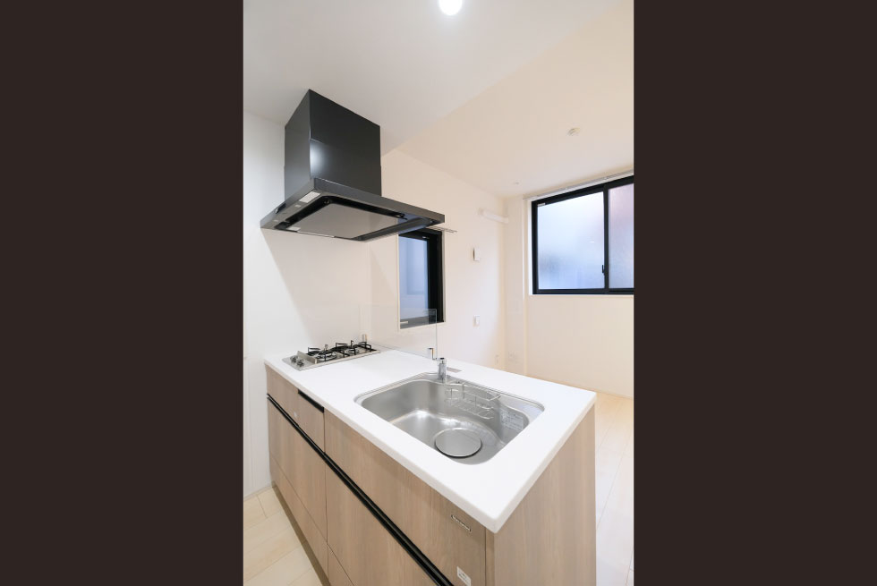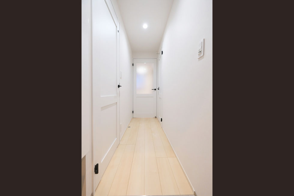 打ち放しコンクリートとブラックの窓枠の直線的なフォルムが洗練された印象を醸し出します。エントランスまわりには住人を温かく迎え入れるようなウッドタイルを使用し、建物中心部分にはコンクリートに木目模様をつけることによって、テクスチャーに変化をつけ、打ち放しとは異なる柔らかな表情を生み出します。内装は、デザインとディテールにこだわり、ミニマルながらも、どんなライフスタイルにも対応できるような間取計画としました。