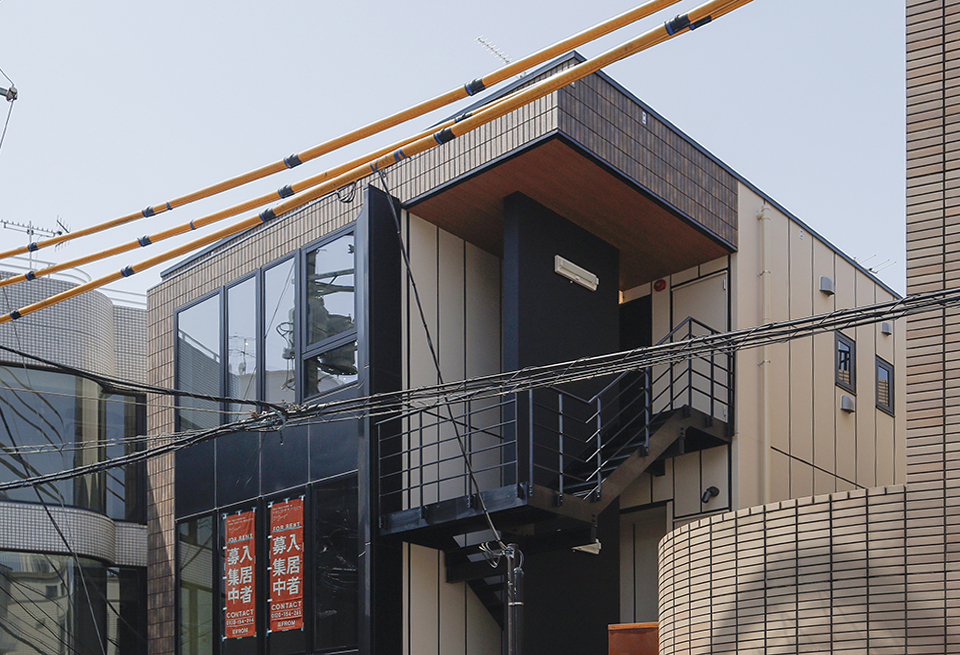 凹凸を強調したブラック×ホワイトのタイルで統一感を持たせながらも、地上と地下の店舗を区切り、地下への入り口も目を惹きやすいデザインとしています。物件が位置する茶沢通りは、センスある雑貨店や飲食店が連なり、休日には歩行者天国になる人気スポット。良好な視認性も確保しているため、抜群のポジショニングを実現しています。窓が付いた明るい共用部に加え、テナント内は3面に窓を配置しているため、店内の雰囲気を優しい明るさで演出します。
