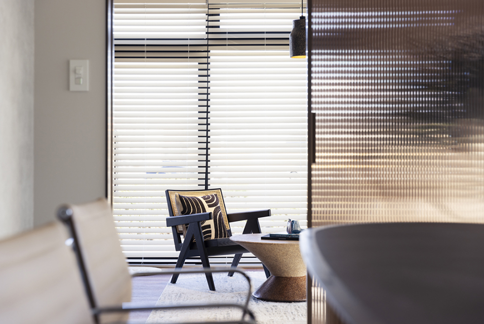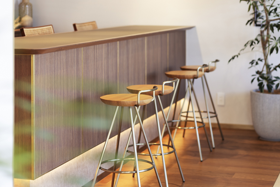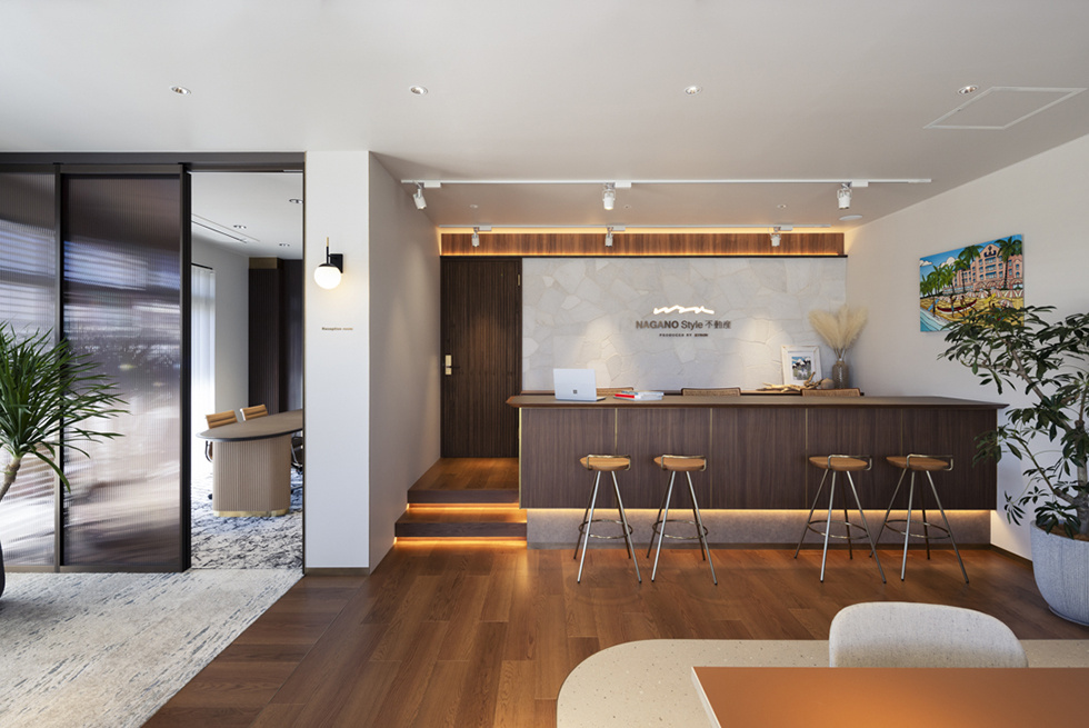 ワークスペースとレセプションスペースを異なる床材で仕上げ、空間を緩やかに分けています。木を基調とした内装に真鍮の金物で重厚感を演出し、ペンダントライトや温かみのある間接照明で心地よい空間を追求。上質なマテリアルや家具で落ち着きある空間を構成し、訪れた人が心地よいひとときを過ごせるようデザインしました。