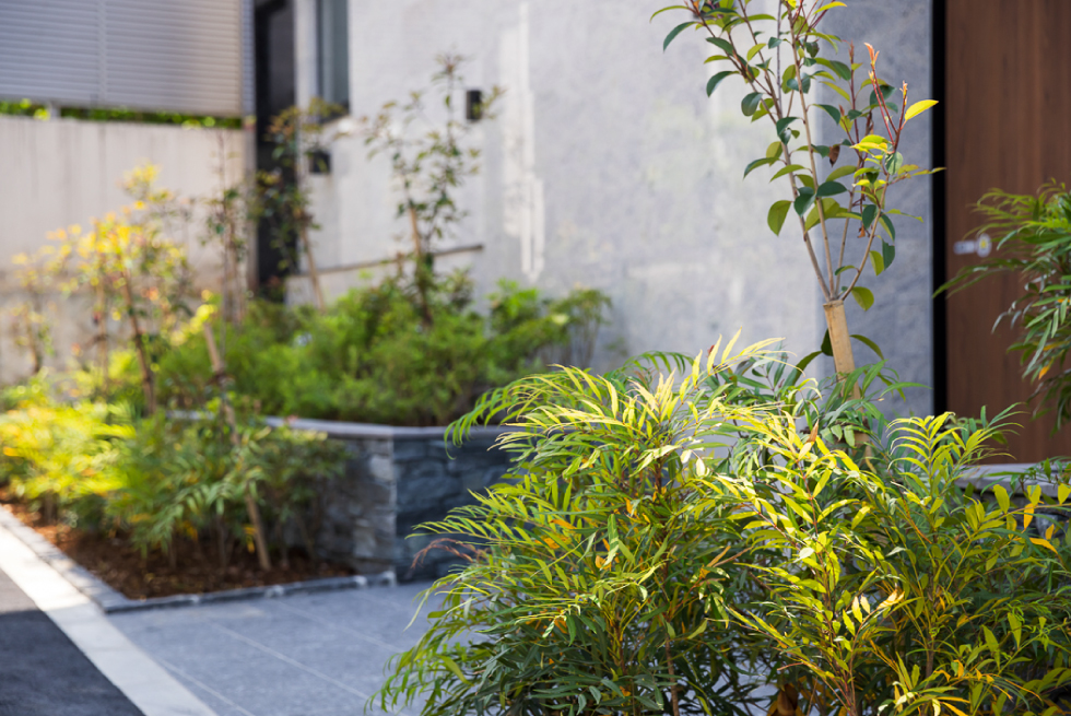 高級感溢れる黒の御影石と流れるような美しい表情を持つライムストーンのファサードが、上質な佇まいを演出。外壁全体には二丁掛タイルを採用。馬張りによって重厚感を持たせ、諏訪山の情緒ある街並みと調和する外観計画とした。