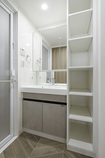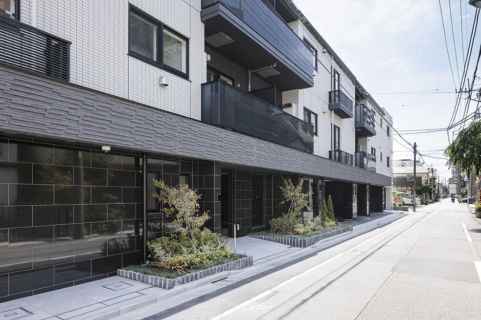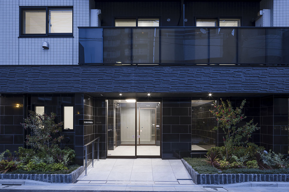 エントランス正面には、大理石調の黒の艶やかな大判タイルを一面に渡って贅沢に使用。陰影が壁面に動きを与える細割ボーダータイルとの重なりが、空間に深みを生み出します。外壁全体に使用している白の二丁掛タイルには特注の黒の目地を採用し、建物全体を引き締め、スタイリッシュな印象に仕上げました。